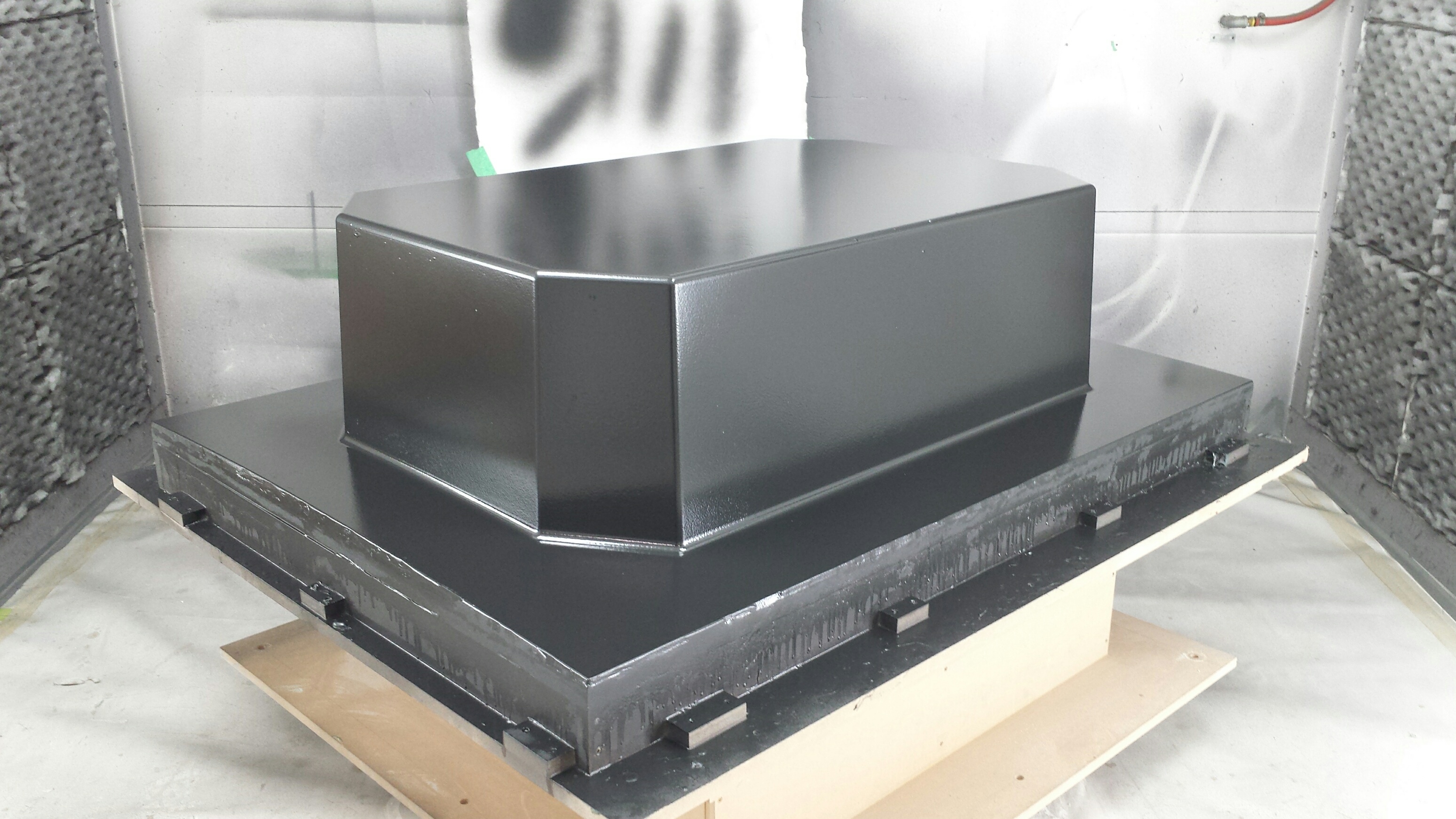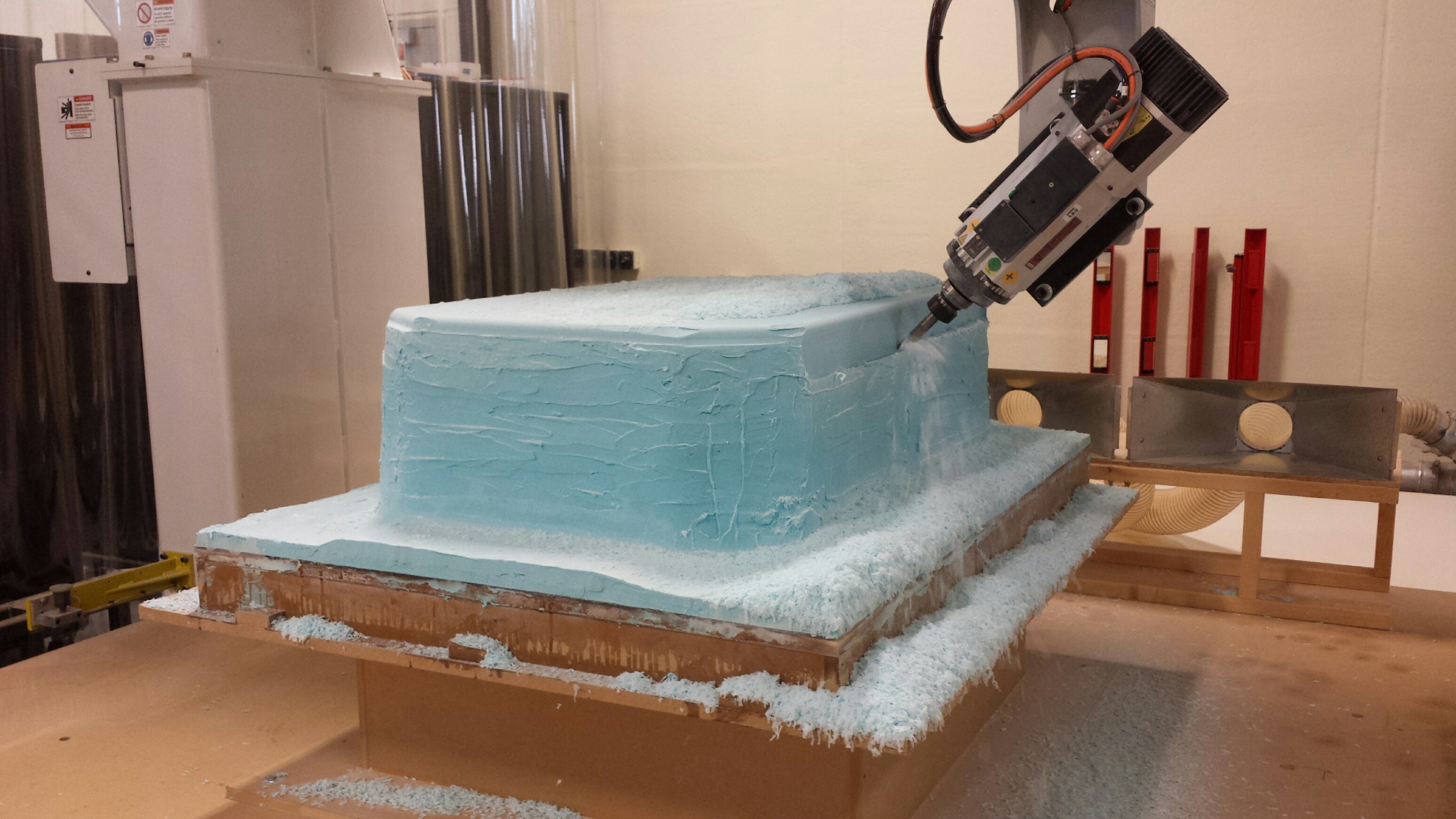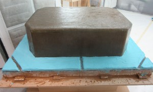This project began with New Flyer defining part geometry and part thickness details with a CAD model and part drawing. We used Siemens NX CAD software to transform the New Flyer CAD model into a wood, fibreglass and tooling paste prototype design. A lightweight crating structure with a tough fibreglass skin was used to support the extruded tooling paste to allow the direct-to-tool pattern to survive several fabrication cycles. The tooling paste was machined to near net geometry and then sprayed with a high-build primer. After many hours of sanding and polishing, a sealer and release were applied and the mould was complete. We then fabricated the prototype roof hatch part using an open-mould manufacturing method, laminating a fibreglass mat and a shaped foam core to the mould in stages.
