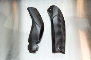From there we developed the manufacturing process and tooling design, including trials to ensure the selected carbon fibre and Kevlar materials were going to work properly and not deform when cured because of the complex shape. The final parts were primarily made with carbon fibre but had an added layer of Kevlar on the back side to protect the person wearing the shell from carbon fibre shards if the shell was broken by a bullet.