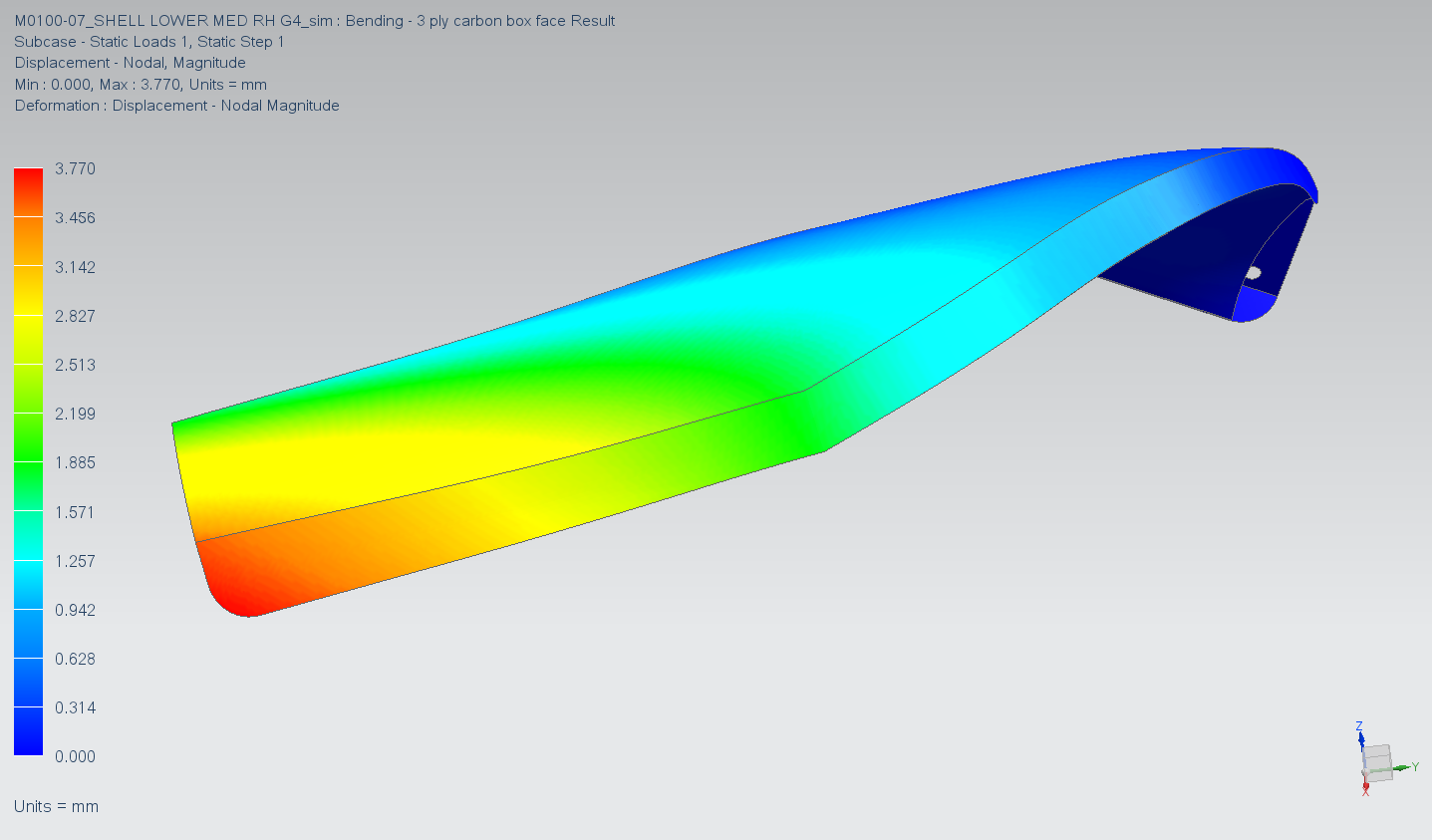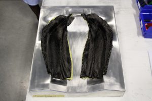 From there we developed the manufacturing process and tooling design, including trials to ensure the selected carbon fibre and Kevlar materials were going to work properly and not deform when cured because of the complex shape. The final parts were primarily made with carbon fibre but had an added layer of Kevlar on the back side to protect the person wearing the shell from carbon fibre shards if the shell was broken by a bullet.